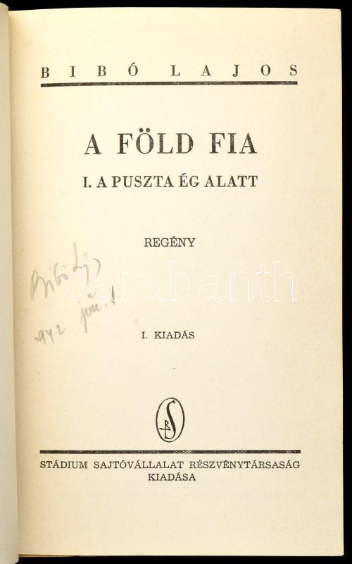 Bibó Lajos: A föld fia I. A puszta ég alatt. Regény. Bp., é.n. (cca 1942), Stádium, 312 p. Első kiadás. Kiadói félvászon-kötés. A szerző által aláírt példány!