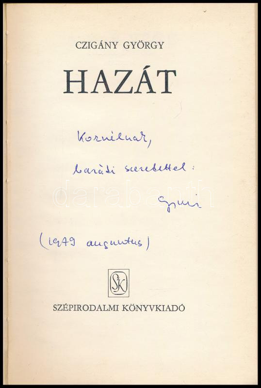 Czigány György: Hazát. Bp., 1979, Szépirodalmi Könyvkiadó. Kiadói egészvászon-kötés, kiadói papír védőborítóban. A szerző, Czigány György (1931- ) Erkel Ferenc-, Liszt Ferenc- és József Attila-díjas író, költő által DEDIKÁLT példány.