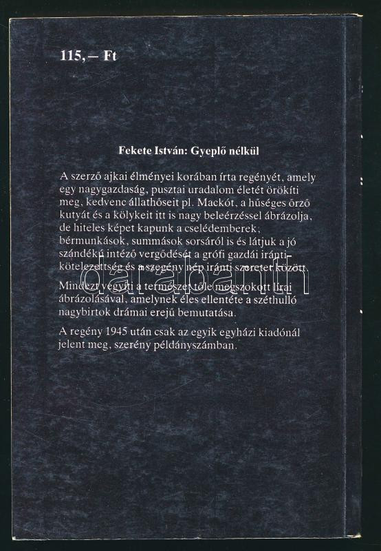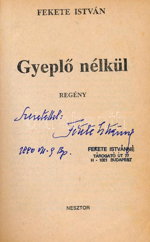 Fekete István: Gyeplő nélkül. Bp., 1970, Nesztor. Kiadói papírkötés. A szerző felesége, Fekete Istvánné (szül. Piller Edit) dedikációjával és bélyegzőjével.