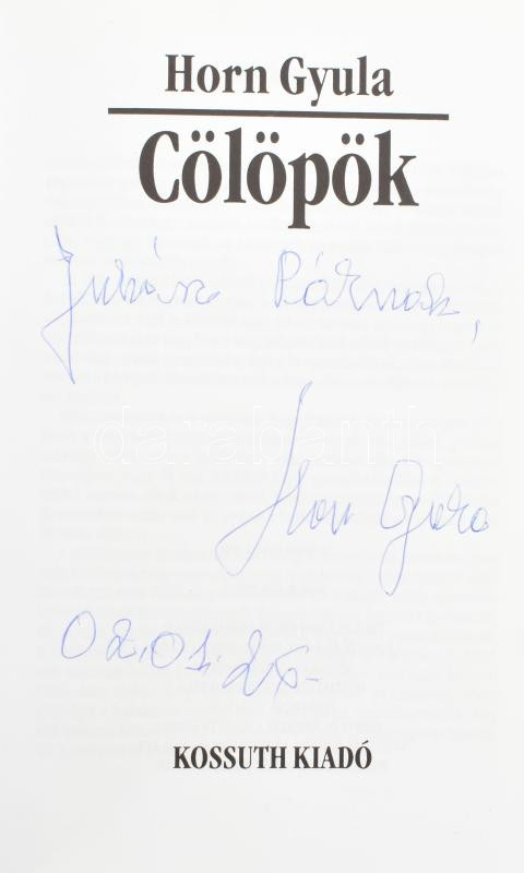 Horn Gyula: Cölöpök. A szerző, Horn Gyula (1932-2013) egykori miniszte... https://www.darabanth.com/hu/447-Gyorsarveres/447.0/Konyvek/Konyvek-Egyeb-ritkasagok~1500027/Horn-Gyula-Colopok-A-szerzo-Horn-Gyula-1932-2013-egykori-miniszterelnok-politikus-altal-~II2962143