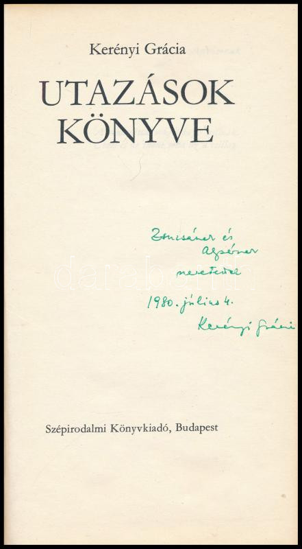 Kerényi Grácia: Utazások könyve. A szerző, Kerényi Grácia (1925-1985) költőnő, magyar-lengyel műfordító, esszéíró, Kerényi Károly klasszika-filológus lánya által Bujdosó Alpár (1935-2021) költő, mérnök, a Magyar Műhely szerkesztője a magyar avantgarde kiemelkedő alakja és felesége részére DEDIKÁLT példány. Bp.,1979,Szépirodalmi. Kiadói kartonált papírkötés, kiadói kopott, kissé sérült papír védőborítóban.;