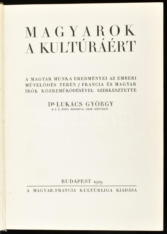 Magyarok a kultúráért. A magyar munka eredményei az emberi művelődés terén. Francia és magyar írók közreműködésével szerk. Dr. Lukács György. Bp., 1929, Magyar-Francia Kultúrliga. Számos illusztrációval. Kiadói, aranyozott félbőr kötésben, kopott borítóval, sérült, kopott gerinccel.