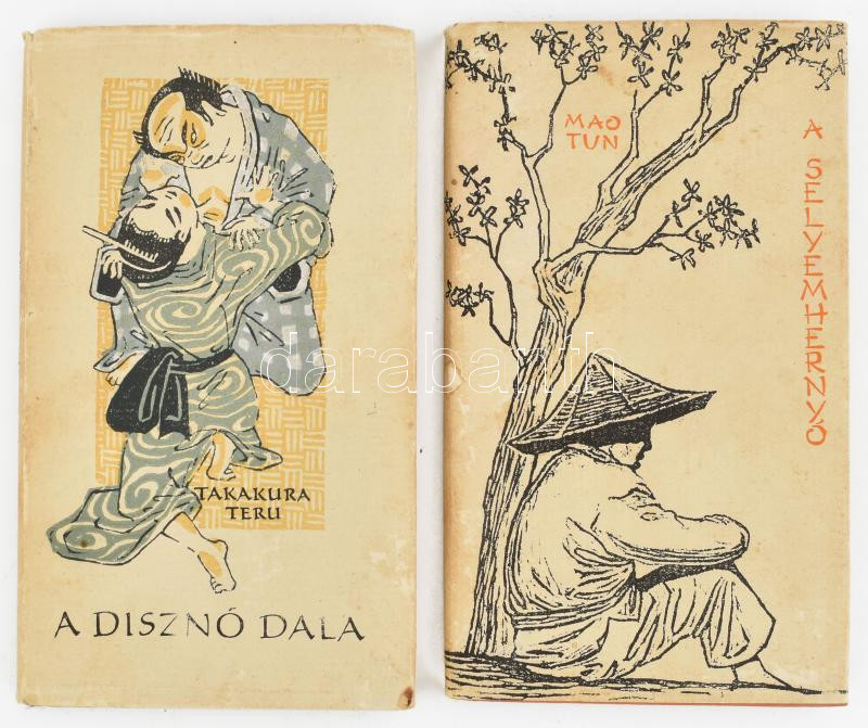 Mao Tun: A selyemhernyó. Bp., 1958, Európa. Molnár Ágnes linómetszeteivel illusztrálva. Kiadói egészvászon-kötés, kissé foltos kiadói papír védőborítóban. + Takakura Teru: A disznó dala. Ford.: Wessely László. Bp., 1958, Európa. A borító és az illusztrációk Molnár Ágnes munkái. Kiadói egészvászon-kötés, kissé foltos borítóval, kiadói papír védőborítóban. Megjelent 5000 példányban.