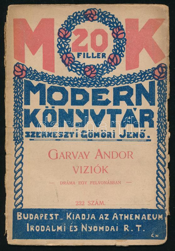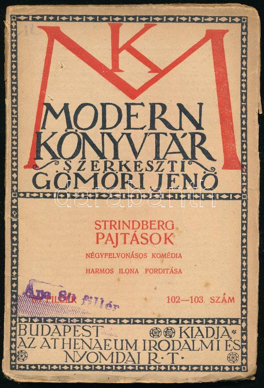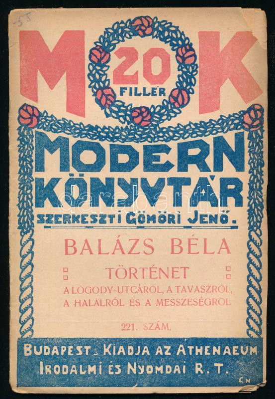 Modern Könyvtár 5 kötete: Kaffka Margit: Csonka regény és novellák. Modern Könyvtár 49. sz. Bp., 1911, Politzer Zsigmond és Fia, 58+4 p. A borító leszakadt és hiányos, a kötése szétvált.; Kóbor Tamás: Egyveleg. (Novellák.) Modern Könyvtár 50. sz. Bp., 1911, Politzer Zsigmond és Fia, 64 p. Kiadói papírkötés, sérült borítóval, felvágatlan példány.; [August] Strindberg: Pajtások. Modern Könyvtár 102-103. sz. Bp.,én,Athenaeum, 72 p. Kiadói papírkötés, szakadt borítóval.; Balázs Béla: Történet a Lógody-utcáról, a tavaszról, a halálról és a messzeségről. Modern Könyvtár 221. sz. Bp.,én,Athenaeum, 32 p. Az elülső borító sarkán hiánnyal, felvágatlan példány.; Garvay Andor: Víziók. Modern Könyvtár 232. sz. Bp.,én,Athenaeum, 32 p. Kiadói papírkötés, szakadt borítóval.