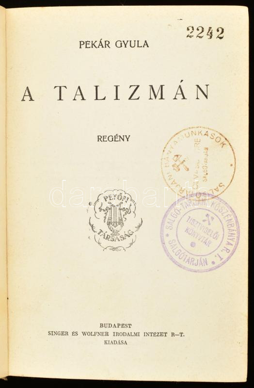 Pekár Gyula: A talizmán. Bp., Singer és Wolfner. Kiadói egészvászon kö... https://www.darabanth.com/hu/447-Gyorsarveres/447.0/Konyvek/Konyvek-Egyeb-ritkasagok~1500027/Pekar-Gyula-A-talizman-Bp-Singer-es-Wolfner-Kiadoi-egeszvaszon-kotes-kopottas-allapot~II2939342