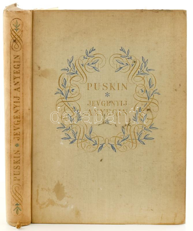 Puskin: Jevgenyij Anyegin. Ford.: Áprily Lajos. Bp., 1953, Új Magyar Könyvkiadó. A kötésterv és a könyvdíszek Végh Gusztáv, a rajzok Zádor István munkái. Egészoldalas illusztrációkkal. Kiadói egészvászon-kötés, kissé foltos borítóval és néhány kissé foltos lappal.