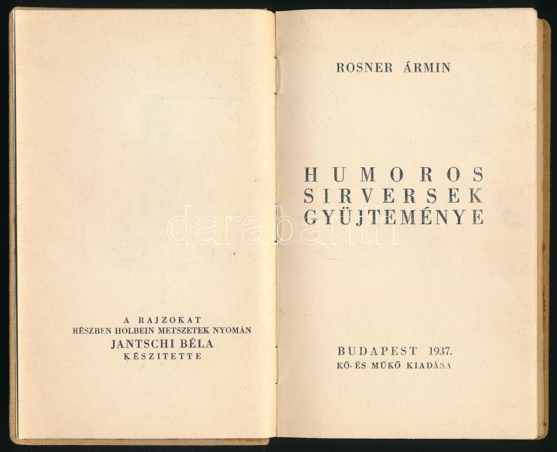 Rosner Ármin: Humoros sírversek gyűjteménye. Bp., 1937, Kő- és Műkő ki... https://www.darabanth.com/hu/447-Gyorsarveres/447.0/Konyvek/Konyvek-Egyeb-ritkasagok~1500027/Rosner-Armin-Humoros-sirversek-gyujtemenye-Bp-1937-Ko-es-Muko-kiadasa-plus-Neveto-fejf~II2962748
