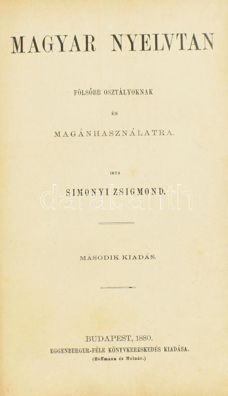 Simonyi Zsigmond: Magyar nyelvtan. Felsőbb osztályoknak és magánhasználatra. Bp., 1880., Eggenberger,(Athenaeum-ny.), VIII+231+1 p. Második kiadás. Korabeli aranyozott gerincű, álbordás félbőr-kötés, kopott borítóval, sérült, részben hiányos gerinccel, ceruzás aláhúzásokkal, bejelöléssel.