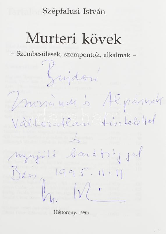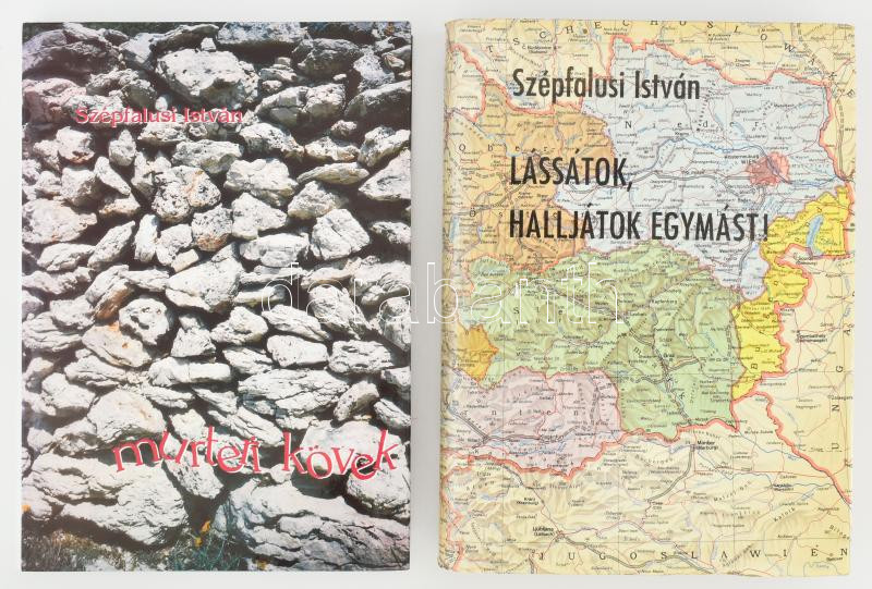 Szépfalusi István 2 műve: A szerző, Szépfalusi István (1932-2000) író, szerkesztő által Bujdosó Alpár (1935-2021) költő, mérnök, a Magyar Műhely szerkesztője a magyar avantgarde kiemelkedő alakja és felesége részére DEDIKÁLT példányok. Lássátok, halljátok egymást! Mai magyarok Ausztriában. Bern, 1980., Európai Protestáns Magyar Szabadegyetem. Térkép-melléklettel. Eső kiadás. Kiadói egészvászon-kötés, kiadói papír védőborítóban.; Murteri kövek. - Szembesülések, szempontok, alkalmak. - [Bp.],1995, Héttorony. Kiadói egészvászon-kötés, kiadói papír védőborítóban.;