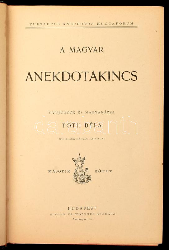 Tóth Béla: A magyar anekdotakincs. II. köt. Thesaurus Anecdoton Hungarorum. Gyűjtötte és magyarázza: - -. Mühlbeck Károly rajzaival. Bp., én., Singer és Wolfner. Kiadói aranyozott, festett, illusztrált egészvászon-kötés, Wolfner-kötés, festett lapélekkel, kopott borítóval, a hátsó táblán kis sérüléssel.
