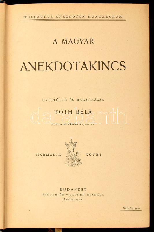 Tóth Béla: A magyar anekdotakincs. III. köt. Thesaurus Anecdoton Hungarorum. Gyűjtötte és magyarázza: - -. Mühlbeck Károly rajzaival. Bp., én., Singer és Wolfner. Kiadói aranyozott, festett, illusztrált egészvászon-kötés, Wolfner-kötés, festett lapélekkel, kopott, foltos borítóval.