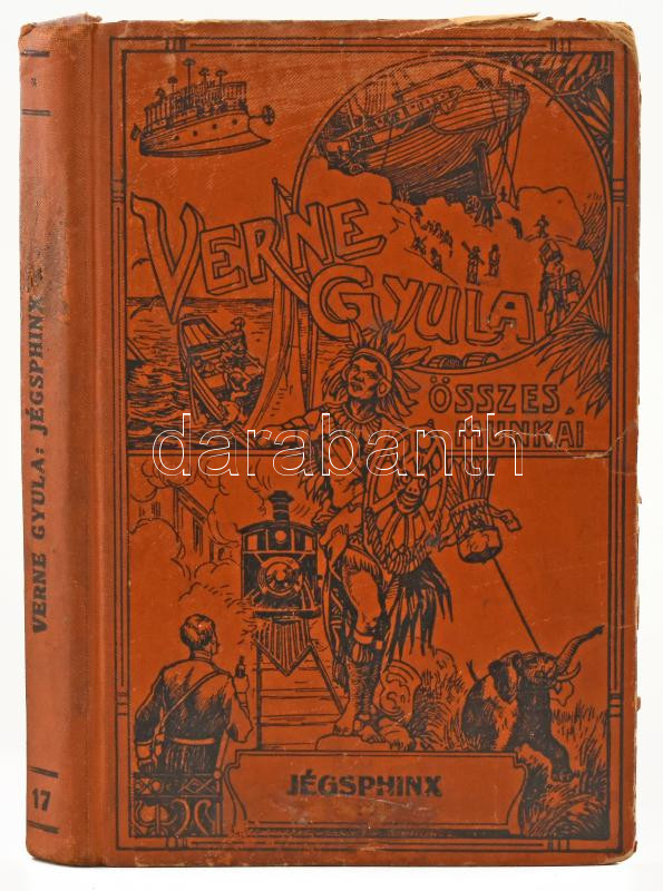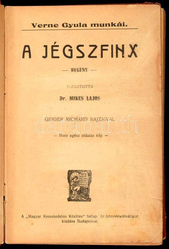 Verne Gyula: A jégszfinx. Regény. Ford.: Mikes Lajos. Geiger Richárd rajzaival. Bp., én., Magyar Kereskedelmi Közlöny. Kiadói félvászon-kötés, kopott borÃtóval, az elülsÅ‘ táblán sérüléssel, 3 kijáró lappal, a hátsó szennylap hiányzik.