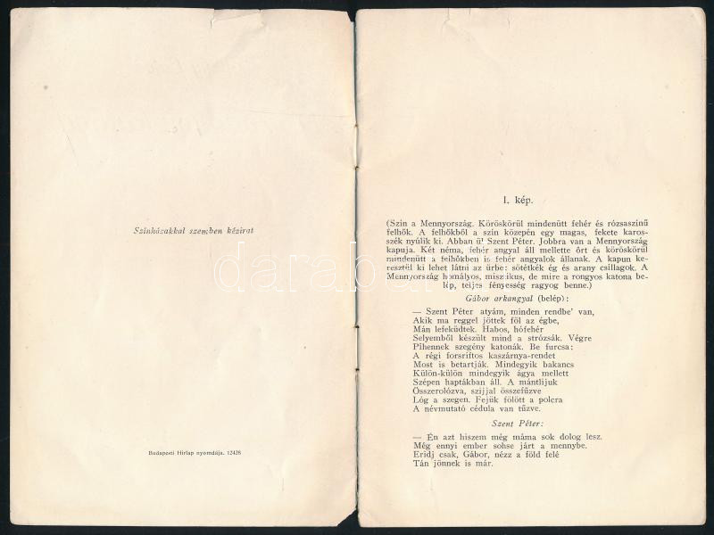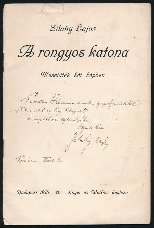 Zilahy Lajos: A rongyos katona. A szerző, Zilahy Lajos (1891-1974) író által DEDIKÁLT példány. Bp., 1915, Singer és Wolfner, 20 p. Borító nélküli példány, a címlapon szakadással.