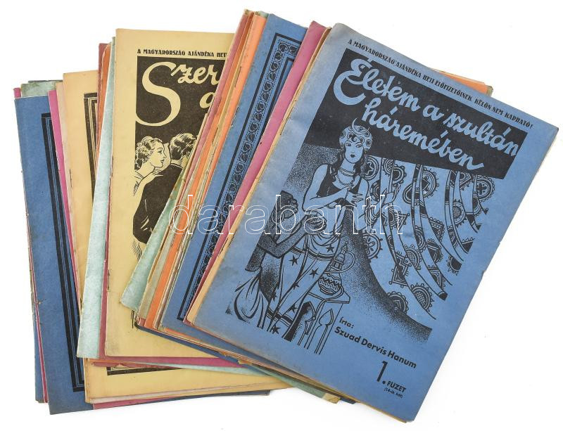 cca 1920-1930 Magyarország ajándéka heti előfizetőinek füzeteinek 32 száma, közter Szuad Dervis Hanum: Életem a szultán háremében 1-4., Jan Molten: A sirászi kaland 1-5.,W. Kingpotter: Az arany ördöge 1.,4, 6., E. Ph. Oppenheim: Üldöz a pénz 3-5., E. Ph. Oppenheim: Szerelem és arany 1., 3., 4., + 1 szám borító nélkül, Ludwig v. Wohl: Don Juan unokája 1-3., Warren G. Holmstead: A fehér boszorkány 1-6., Horst Biernath 1.,4.,5.,7. Változó állapotban, közte foltos, néhány sérült borítóval, de a többség jó állapotban.