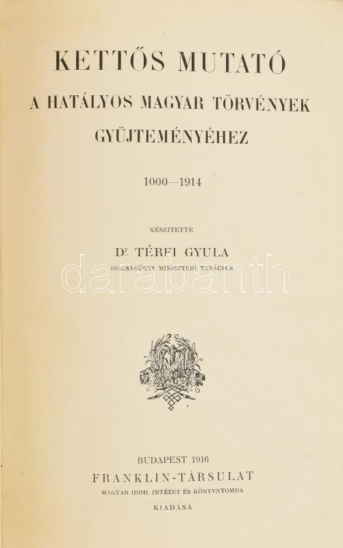 Térfi Gyula: Kettős mutató a hatályos magyar törvények gyüjteményéhez 1000-1914. Bp., 1916, Franklin. 383 p. Kiadói félvászon kötésben, gerincen kopásnyomokkal, máskülönben jó állapotban.