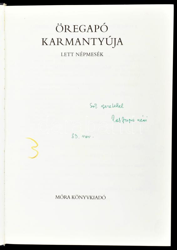 Öregapó karmantyúja. Lett népmesék. Ford.: Rab Zsuzsa. A fordító, Rab Zsuzsa (1926-1998) József Attila-díjas író, költő, műfordító, által DEDIKÁLT példány. Bp.,1983,Móra. Réber László rajzaival. Kiadói kartonált papírkötés.