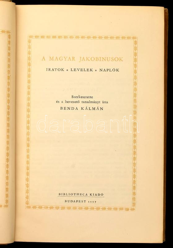 A magyar jakobinusok. Iratok, levelek, naplók. Szerk. és a bevezető tanulmányt írta: Benda Kálmán. Aurora VIII. Bp., 1957., Bibliotheca. Kiadói kopott, kissé foltos félvászon-kötés.