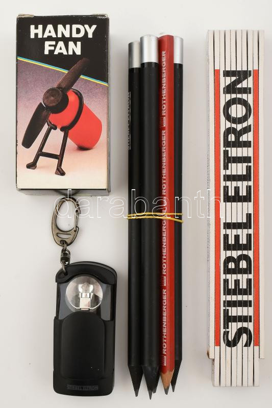Leírás: 2 m-es zollstock + elemes kézi ventilátor + kulcstartó elemlámpa + 5 db ácsceruza