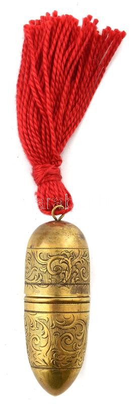 Leírás: Díszes, aranyozott fém varrótűtartó, benne gyűszű és cérna, h: 5 cm