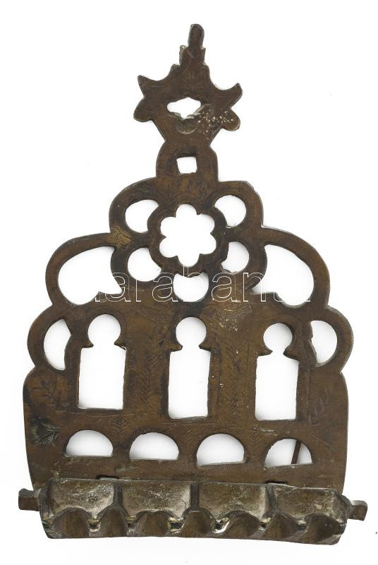 Antik hanukiah, XIX. sz., bronz, 20x14 cm https://www.darabanth.com/hu/447-Gyorsarveres/447.0/Mutargy-papirregiseg-egyeb/Judaika~2000116/Antik-hanukiah-XIX-sz-bronz-20x14-cm~II2964389