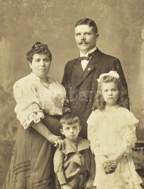 cca 1900-1910 Stern Izidor papírkereskedő névjegykártyája, szakadozott céges borítékja, és családi portréja fotója Schmidt Ede budapesti műterméből, 16x11 cm