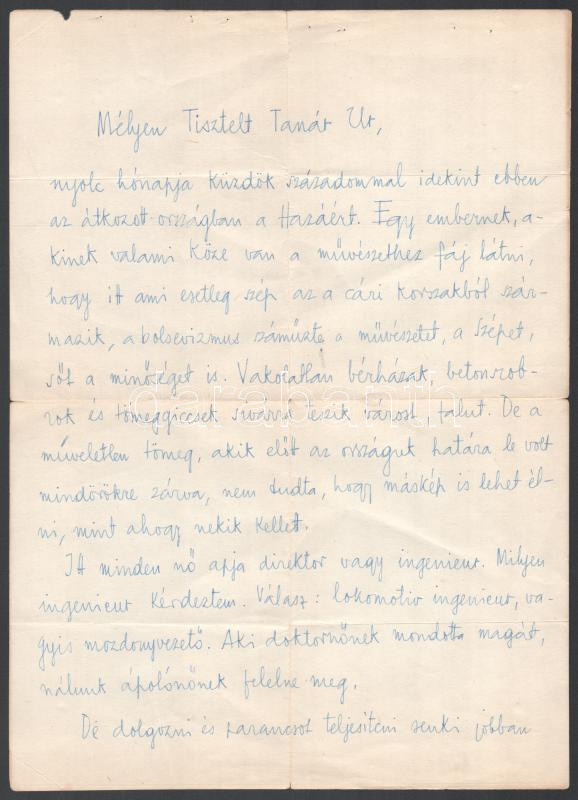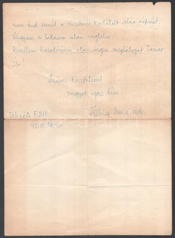 1943 Telbisz Imre százados, a kecskeméti közelfelderítő repülőszázad parancsnokának hazaküldött levele a keleti frontról, amelyben a bolsevizmus által lezüllesztett Oroszországban uralkodó körülményekről ír egy volt tanárának, másfél kézzel írt oldal