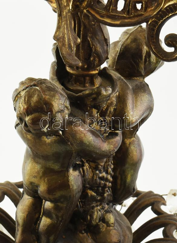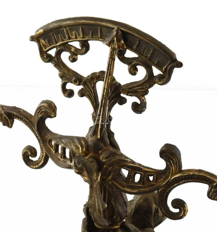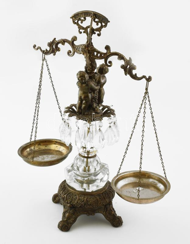 Leírás: Antik puttó figurákkal díszített kétkaros mérleg, fém, bronzírozott fém, üveg, sérülésekkel, m: 53 cm