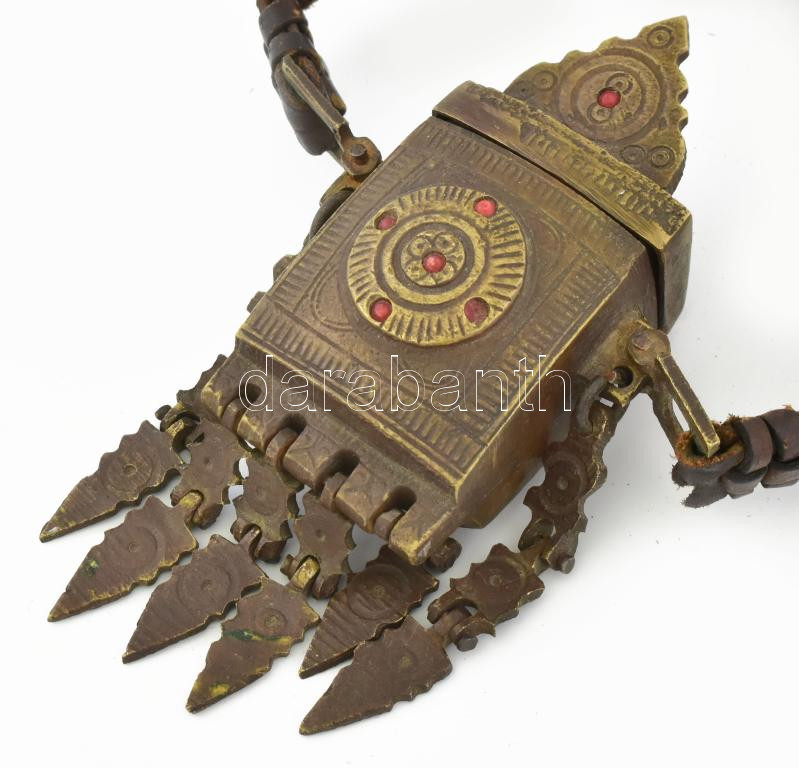 Leírás: Oszmán / török lőszertartó, bronz, berakásokkal, szerelékkel díszített, bőr szíjjal, 12x4 cm