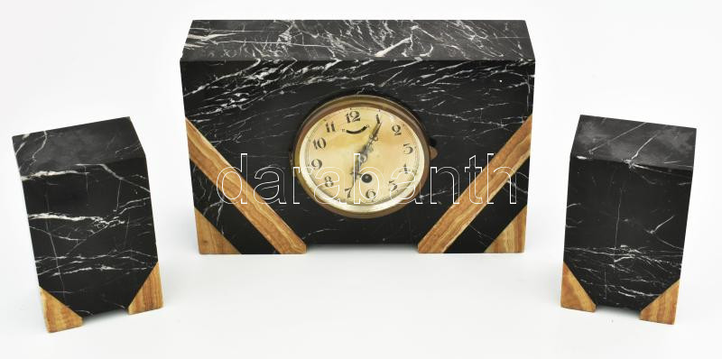 Leírás: Régi francia? márvány testű art deco kandallóóra szett, kulcs nélkül, kopással, 30x20x9 cm, 15,5x10x7 cm