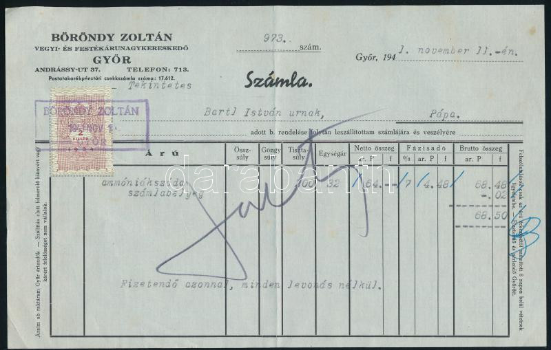 1941 Böröndy Zoltán Vegyi- és Festékárúnagykeresekedő, Győr fejléces s... https://www.darabanth.com/hu/447-Gyorsarveres/447.0/Mutargy-papirregiseg-egyeb/Reklam~2000113/1941-Borondy-Zoltan-Vegyi-es-Festekarunagykeresekedo-Gyor-fejleces-szamla~II2963402