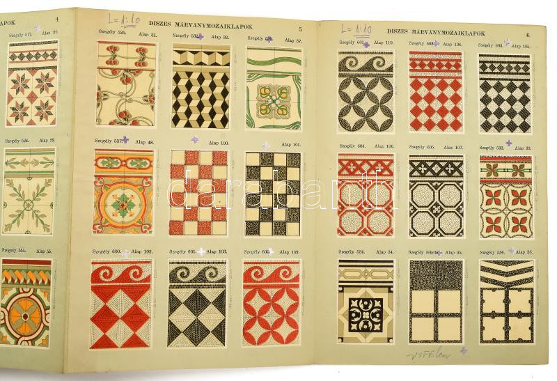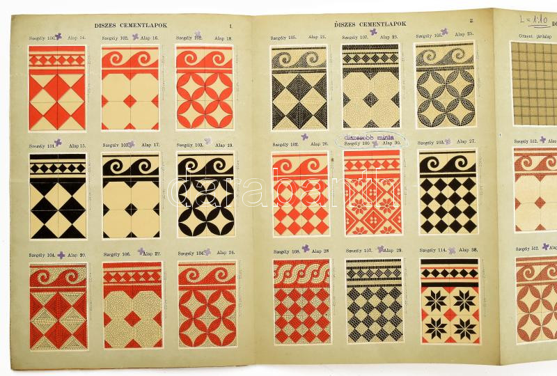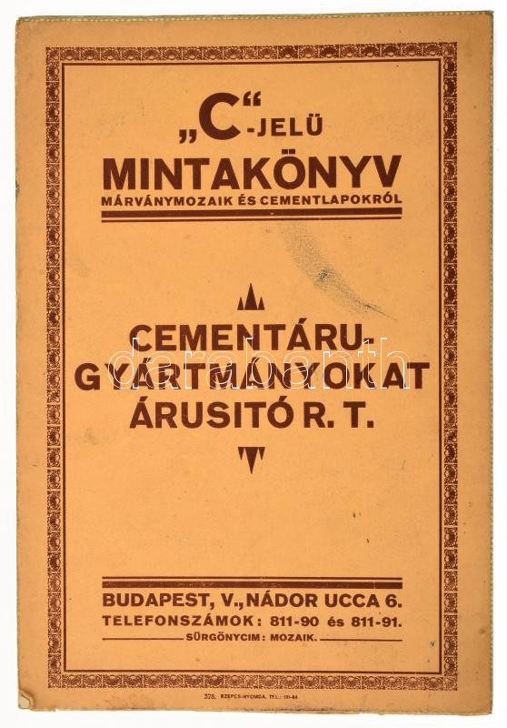 cca 1930 Cementárugyártmányokat Árusító Rt. "C" - jelű mintakönyv márványmozaik és cementlapokról. Bp., Szepes-ny., kihajtható prospektus, díszes mozaikpadló illusztrációkkal, köztük részben art deco és szecesszió is. Kiadói papírkötés, foltos borítóval.