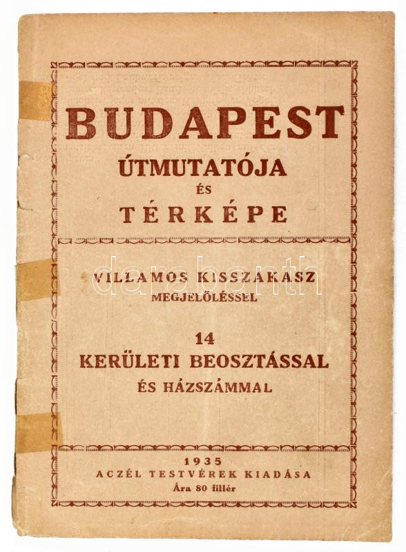 Leírás: 1935 Budapest útmutatója és térképe. Bp., 1935, Aczél Testvérek kiadása, 35+(2) p. + 1 t. (kihajtható, 70x55 cm). Kiadói tűzött papírkötés, sérült, javított, lejáró borítóval.