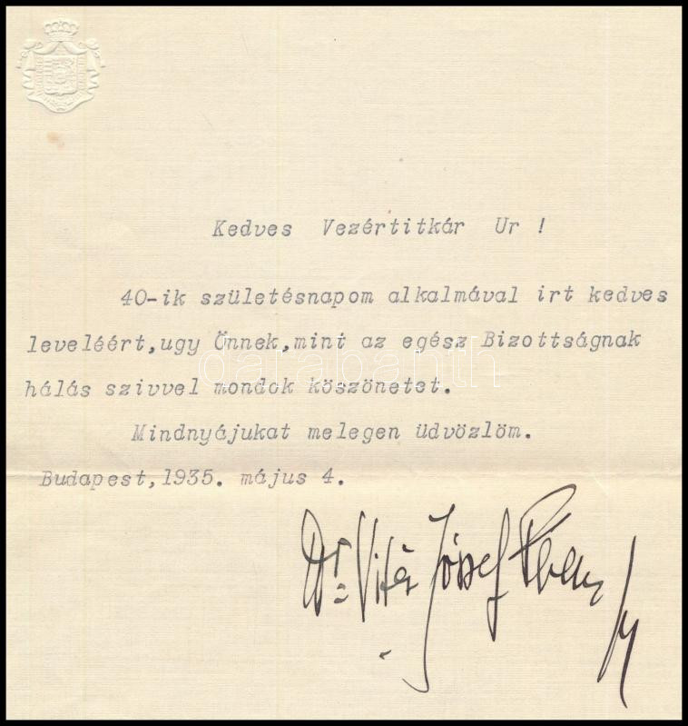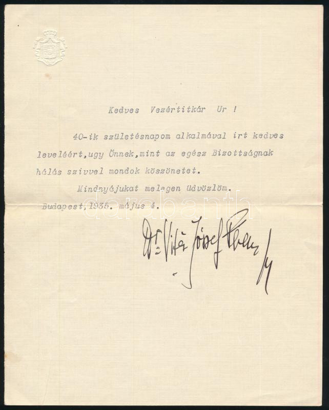 1935 Bp., Habsburg-Lotaringiai József Ferenc (1895-1957) főherceg autográf aláírása 40. születésnapja alkalmából kapott köszöntését megköszönő gépelt levelén, dombornyomott címeres levélpapíron