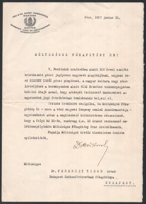 1937 A Pécsi M. kir. Erzsébet tudományegyetem rektorának levele dr. Ferenczy Tibor budapesti főkapitánynak melyben az egyetem Szepesy Ignác emléktábla avatására hívja meg mint a püspök leszármazottját