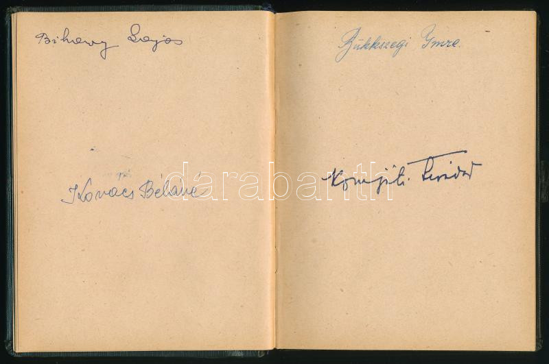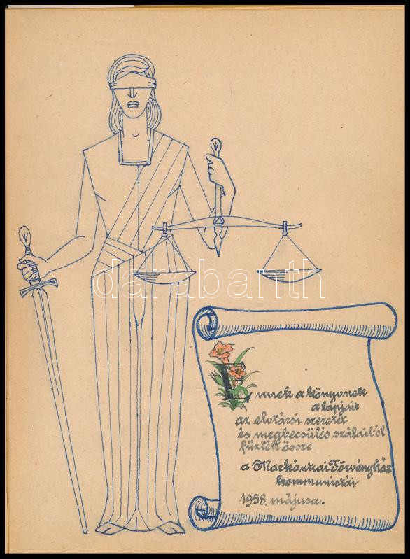 Leírás: 1958 A Markó utcai törvényház kommunistáinak (dolgozóinak) aláírásai. Összesen 64 aláírás emlékkönyvben. egészbőr kötés, rajzokkal