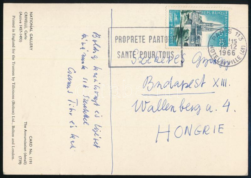 1966 Csernus Tibor (1927-2007) Kossuth-díjas festő, grafikus és felesége saját kézzel írt karácsonyi és újévi üdvözlő sorai, egy képeslapon, Szekeres György (1914-1973) újságíró, műfordító, az Európa Kiadó főszerkesztője részére, saját kezű aláírásaikkal