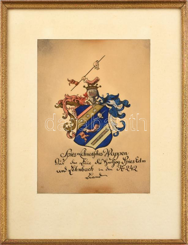 Spies-Lehner nemesi törökverÅ‘ család, eredetileg hercegi család cÃmere (Spies Lehnerisches Wappen aus der Linie des Hertzog Spies Edmund Lehnbach). Tempera, papÃr, jelzés nélkül. 18x13 cm. Üvegezett fakeretben.