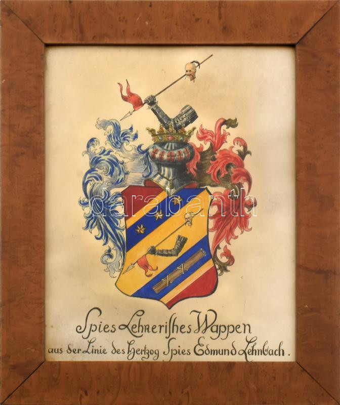 Spies-Lehner nemesi törökverÅ‘ család, eredetileg hercegi család cÃmere (Spies Lehnerisches Wappen aus der Linie des Hertzog Spies Edmund Lehnbach). Tempera, papÃr, jelzés nélkül. 28x22 cm. Üvegezett fakeretben.