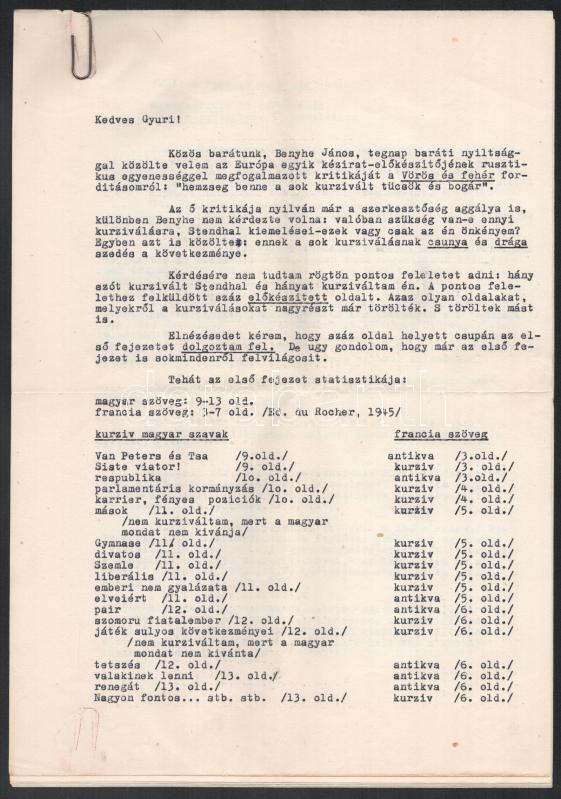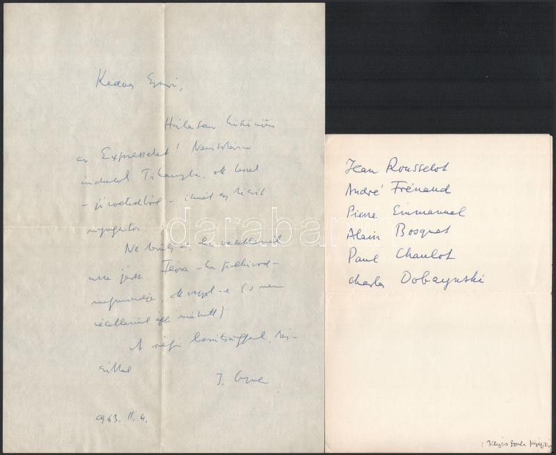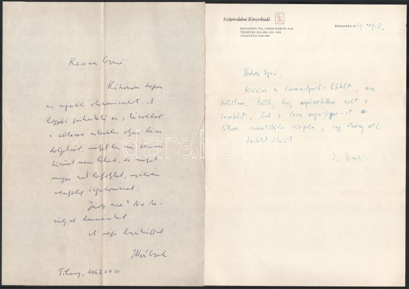 cca 1963-1971 Illés Endre (1902-1986) író, drámaíró, műfordító, műkritikus, a Szépirodalmi Könyvkiadó vezetőjének saját kézzel írt levelei, 5 db, valamint 1 db gépelt levele saját kezű aláírásával, valamint 1 db karácsonyi és újévi üdvözlőlapja, rajta Borsos Miklós (1906-1990) rézkarcával. Szekeres György (1914-1973) újságíró, műfordító, az Európa Kiadó főszerkesztője részére. A rézkarcon hajtásnyommal.