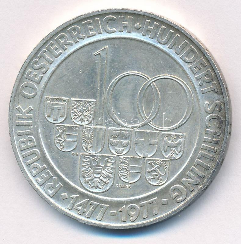 Austria 1977. 100 Schilling Ag "500th Anniversary of the Hall Mint" C:AU patina, small scratch