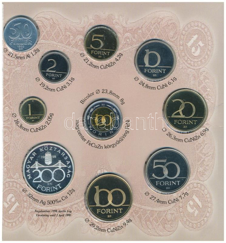 1998. 50f-200Ft (10xklf) forgalmi sor, dísztokban, belső borító ragasztása kissé elengedett, a 100Ft-os emlékérem a lappal együtt hiányzik T:PP patina Adamo FO31.1