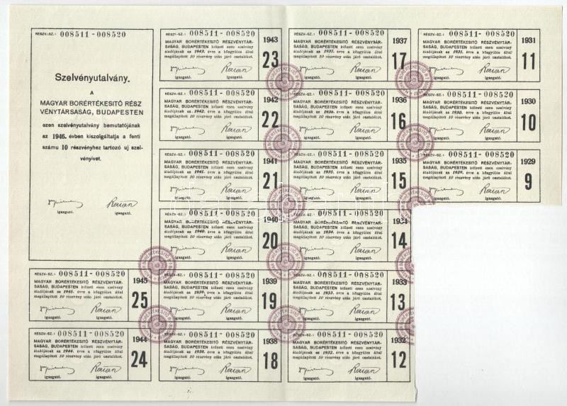 Leírás: Budapest 1926. "Magyar Borértékesítő Részvénytársaság" 10 részvénye összesen 100P-ről, szelvényekkel, szárazpecséttel (3x) T:VF kis szakadás