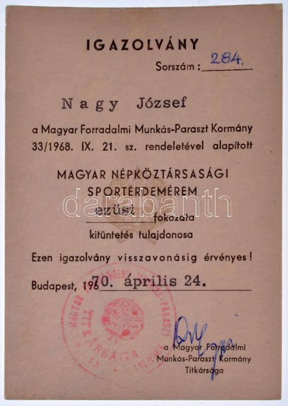 Leírás: 1949. "Magyar Népköztársasági Sportérdemérem ezüst fokozata" aranyozott, zománcozott bronz kitüntetés mellszalaggal, eredeti tokokban T:AU