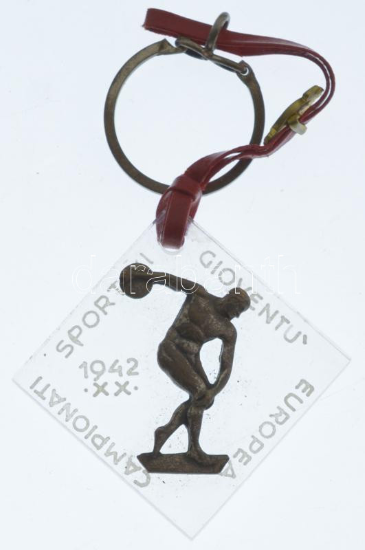 Leírás: Olaszország 1942. "Ifjúsági sport Európa-bajnokság" plexi plakett ezüstözött fém diszkoszvető rátéttel, furattal (34x34mm) T:AU
