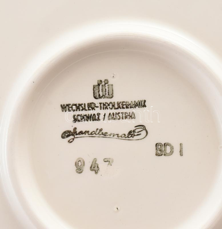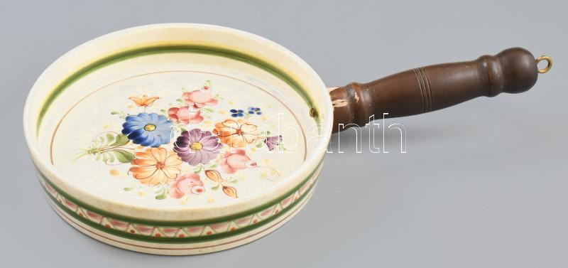 Osztrák mázas kerámia edény fa nyéllel, kézzel festett virágos mintával, jelzett: Wechsler-Tirolkeramik, Schwaz, Austria. A nyélen kopásokkal, egyébként hibátlan, d: 22 cm