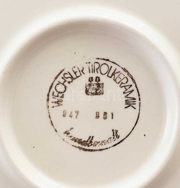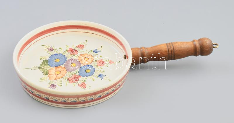 Leírás: Osztrák mázas kerámia edény fa nyéllel, kézzel festett virágos mintával, jelzett: Wechsler-Tirolkeramik (Schwaz, Austria), hibátlan, d: 22 cm