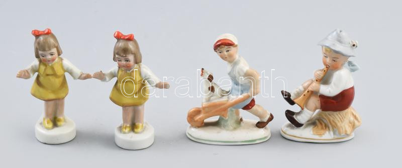 Leírás: 4 db porcelán figura: kisfiú talicskával, fuvolázó fiú, táncoló lánykák. Kézzel festett, részben jelzett, változó állapotban, m: 8 - 9 cm