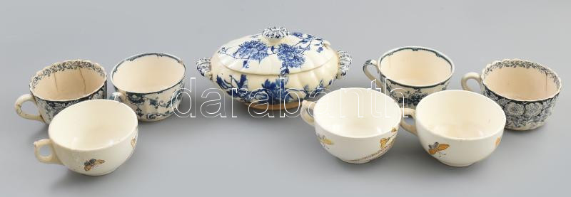 Leírás: cca 1880-1900 7 darab antik angol teáscsésze + szószkínáló edény, közte jelzéssel, sérülésekkel