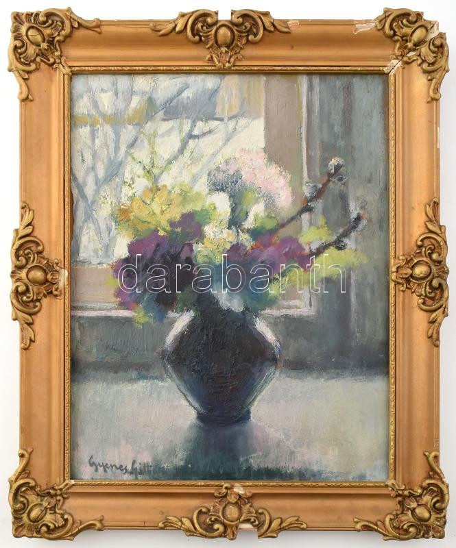 Gyenes Gitta jelzéssel: Csendélet. Olaj, karton. Dekoratív, sérült fak... https://www.darabanth.com/hu/448-Gyorsarveres/448.0/Festmenyek-es-grafikak/Festmenyek-es-grafikak-jelzessel-jelzes-nelkul~1000002/Gyenes-Gitta-jelzessel-Csendelet-Olaj-karton-Dekorativ-serult-fakeretben-36x28-cm~II2966401