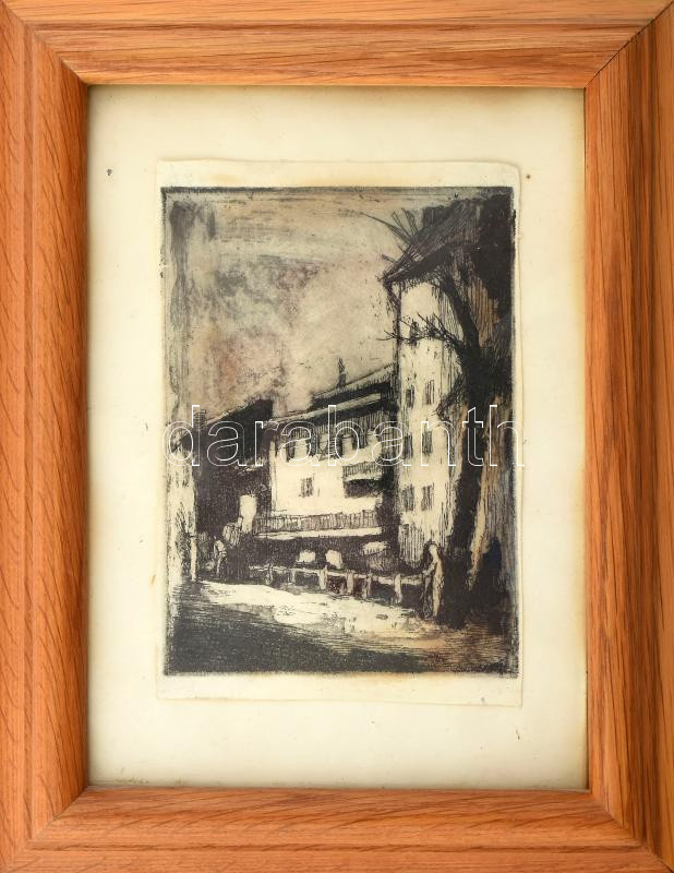 Leírás: Jelzés nélkül: Utcarészlet. Rézkarc, papír. Üvegezett fakeretben. 13x9 cm